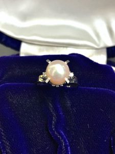 パールの両脇に小さなダイヤモンドが輝くこちらのリング。
