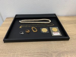 パールネックレスや18金ネックレス、プラチナダイヤモンドリングと5万・10万円金貨です。
