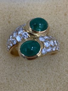 18金にエメラルド2つと天然ダイヤモンドが散りばめられている とてもゴージャスなリングです。