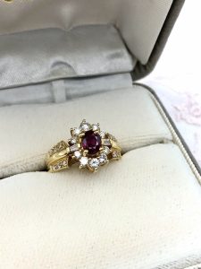 中石のルビーをダイヤがぐるりと囲んだデザインがゴージャスですね💕