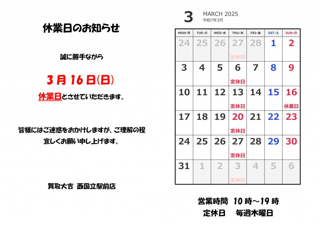 【定期ポスト・3月の休業日のお知らせ】3月16日(日)は休業日とさせていただきます。 | 西国立駅前店