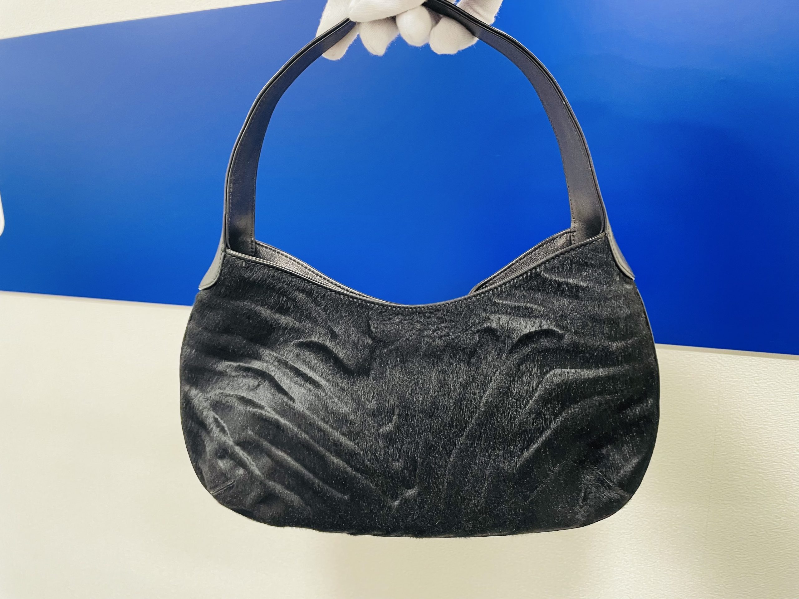こちらは落ち着いた黒のレザー×ハラコのワンショルダーバッグですね(^^)