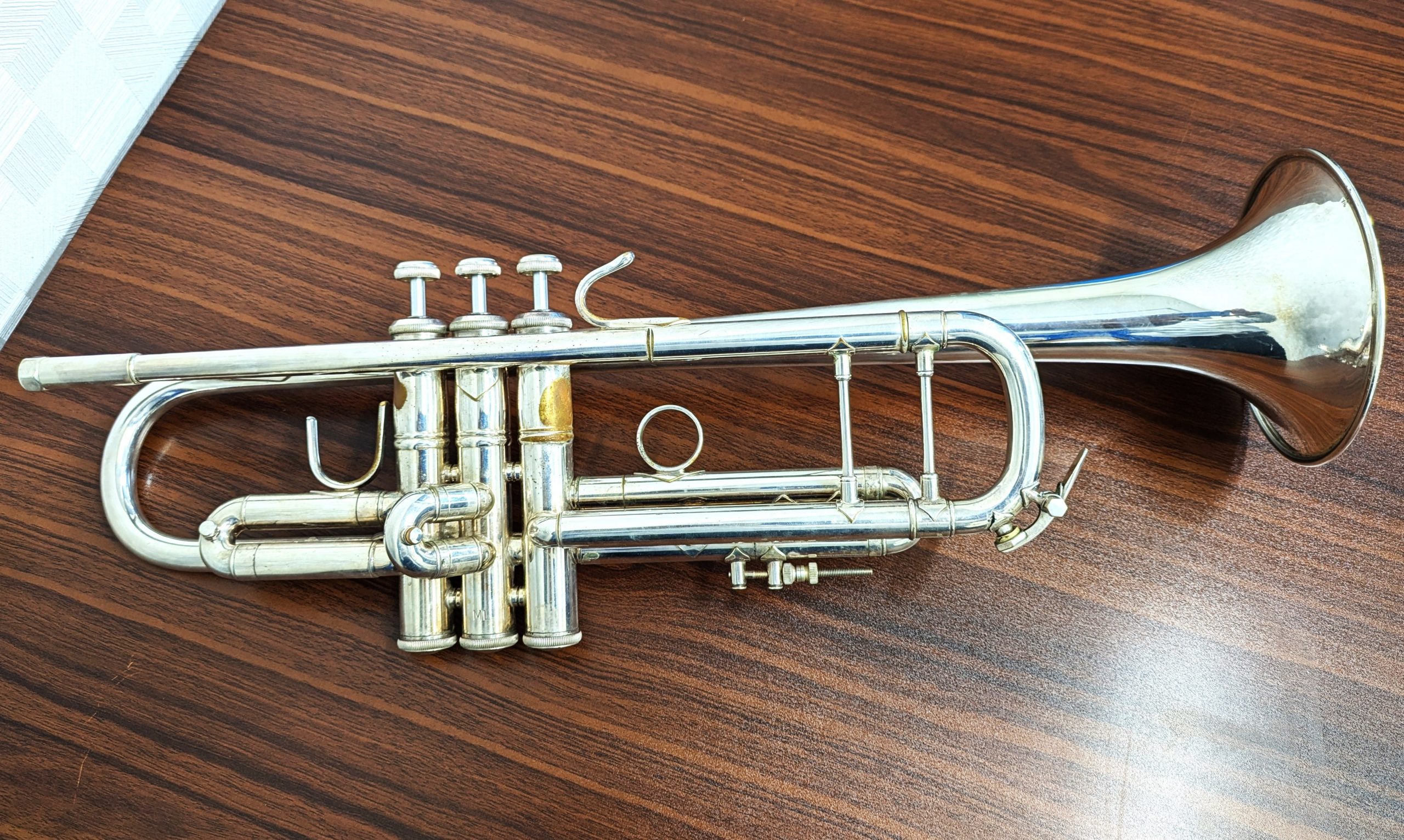 写真のトランペットには、演奏技術の習得に熱心に取り組まれたこと、かつ楽器の手入れを日々丁寧にされていたことが伺え、お客様との談話から、目には見えない付加価値を深く共感させていただきました。