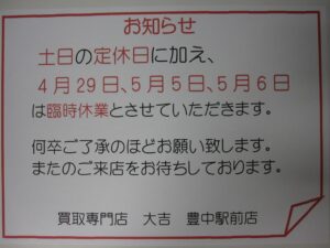 ☆お知らせ☆ゴールデンウィークの営業日に関して | 豊中駅前店