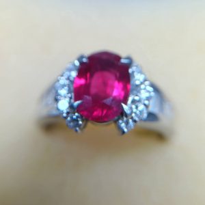 ルビー2.23カラット、周りにダイヤが散りばめられたプラチナリングです。