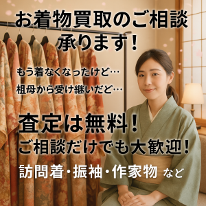 ✅ 査定は無料! ご相談だけでも大歓迎! ✅ 状態に応じた査定! シミや汚れがあっても買取OK ✅ 高価買取のチャンス! 作家物・有名産地の着物は特に高評価! ✅ 帯・羽織・小物も一緒に査定可能!