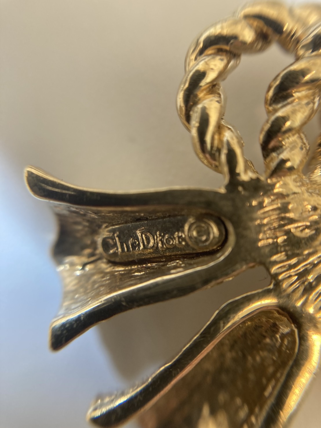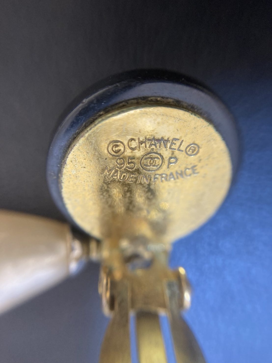 コスチュームジュエリーということもあり、ゴールドカラーの部分にはメッキを使用し、ラインストーンやパールを取り入れたものはイミテーションを使用しています。