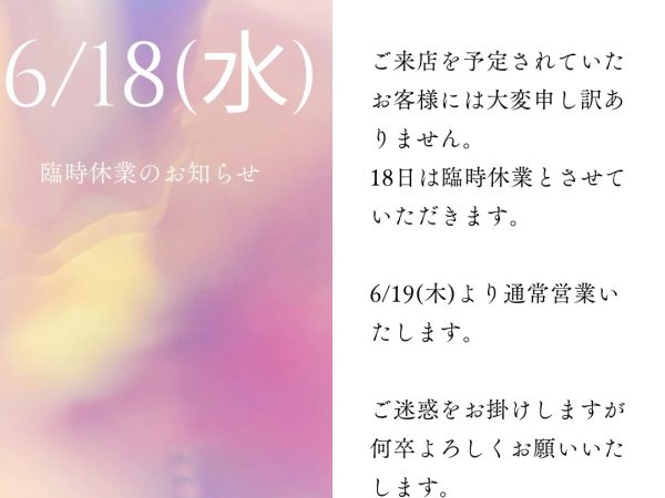 明日、令和7年6月18日(水)は臨時休業させていただきます!!