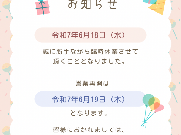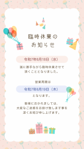明日、令和7年6月18日(水)は臨時休業させていただきます!!