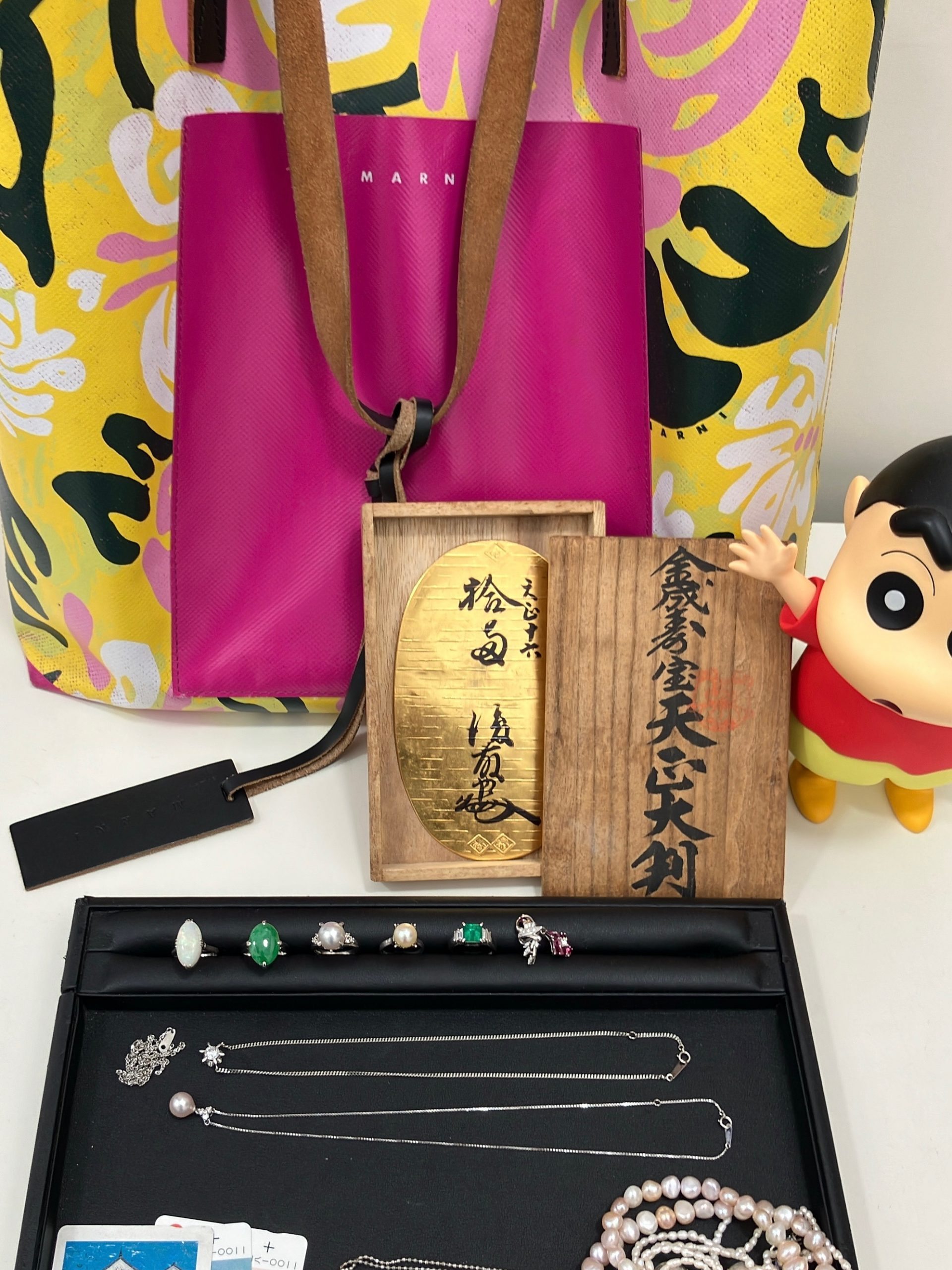 マルニ ハンドバッグ、光り輝くたくさんのPt900ダイヤネックレス、エメラルド/真珠リング、メッキアクセサリー、古銭、テレカをお買取りさせていただきました🍀