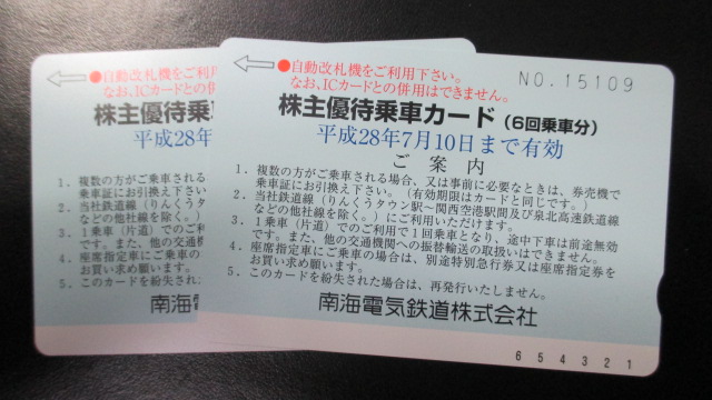 南海電鉄株主優待乗車カードお買取り致しまた。