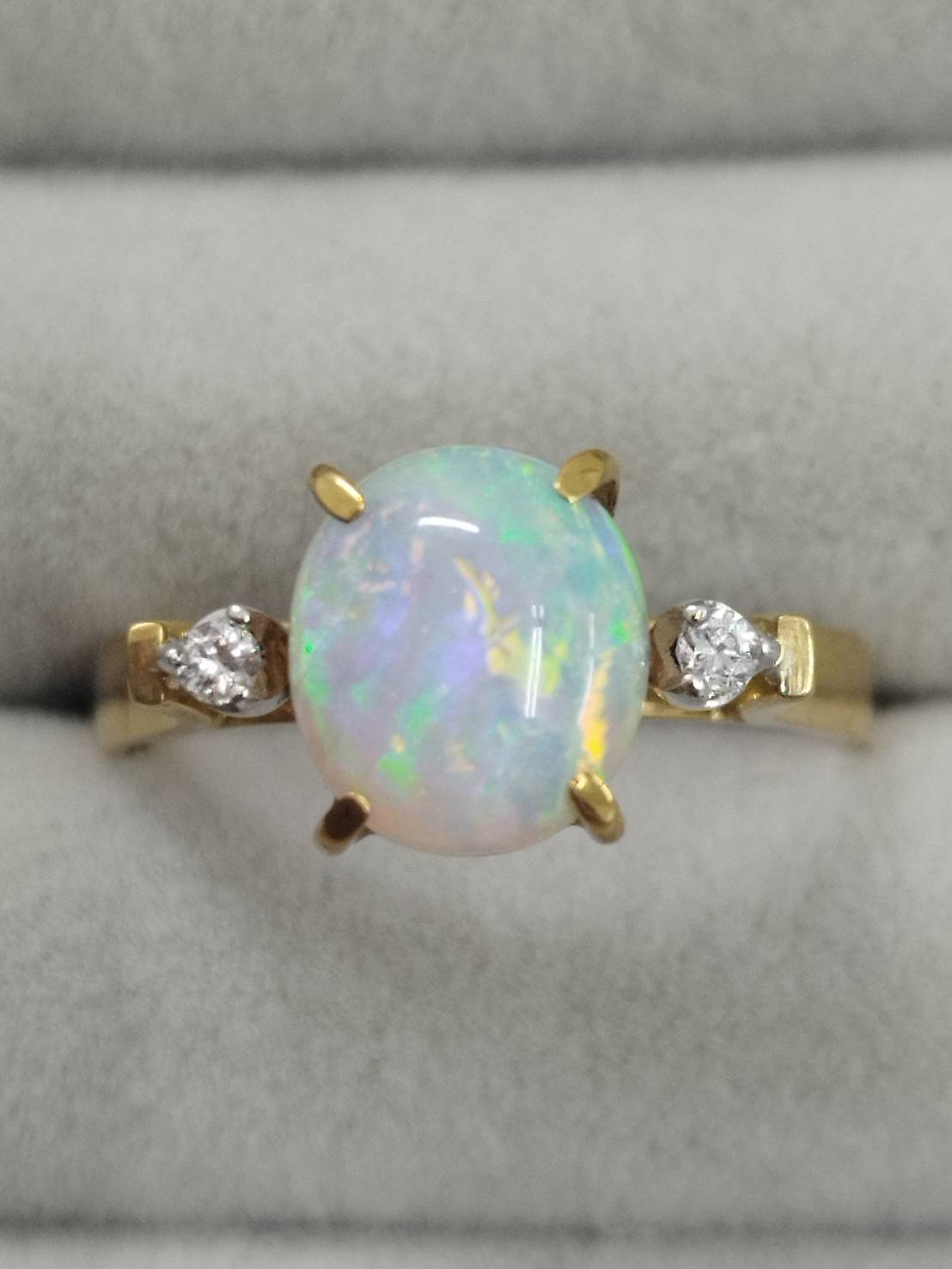 18金の台座にセットされたオパールは角度によって表情も変わり幻想的な輝きを放ちます。
