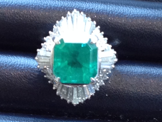 画像のエメラルドリングは10ct以上の大粒エメラルドにメレダイヤがちりばめられた素敵なリングでした。