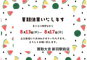 買取大吉» 店舗紹介» 新羽駅前店» 新羽駅前店 店長ブログ» 夏期休業のお知らせ