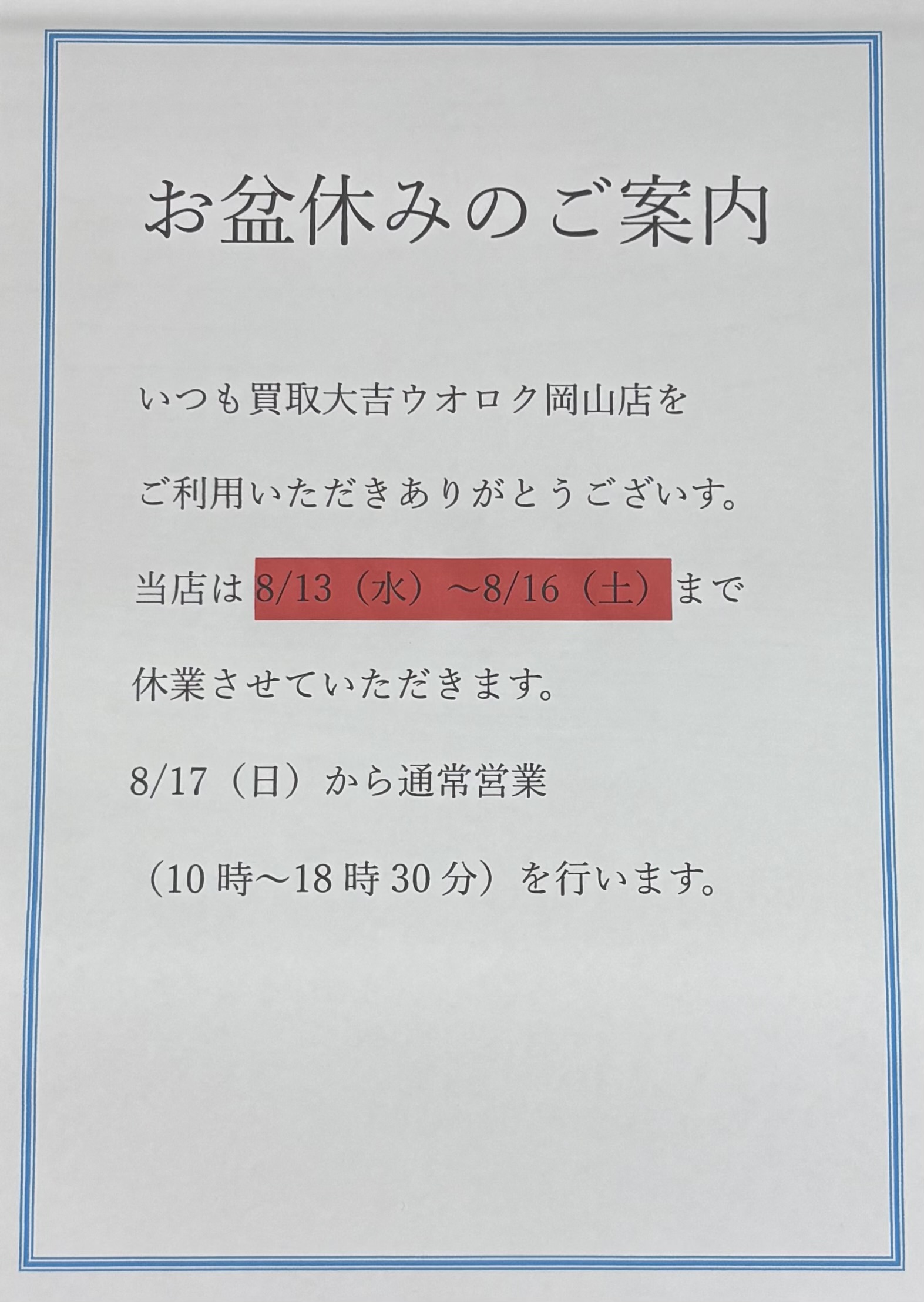 夏季休暇のご案内!阿賀野市にございます買取大吉ウオロク岡山店です。 | ウオロク岡山店