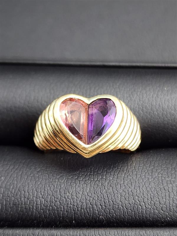 K18イエローゴールドのベースに、ピンクトルマリンとアメジストが左右にセットされたハート型モチーフ。色のバランスが美しく、ブルガリらしい遊び心と上品さが感じられるデザインです。