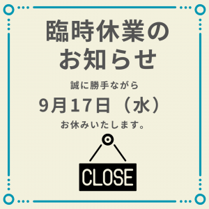 9/17(水)誠に勝手ながら、臨時休業とさせていただきます。