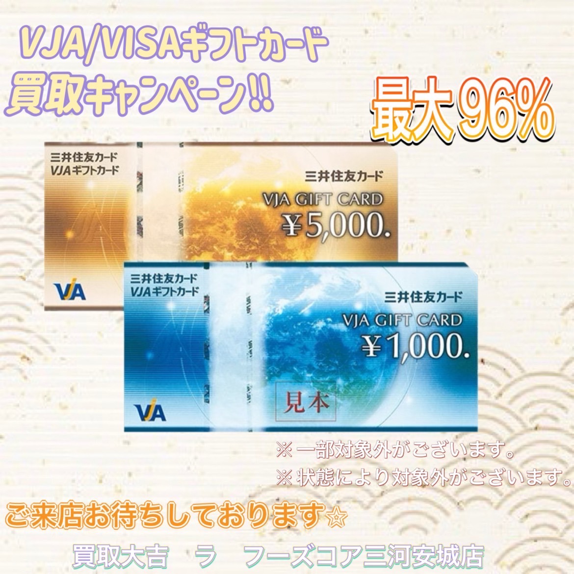 当店では、本日から9月19日~9月25日までVJAギフトカードを最大96%で買取強化しております!