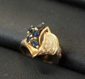 本日はダイヤモンドとサファイアの18金の指輪を柏原市のお客様にお持ちいただきました。