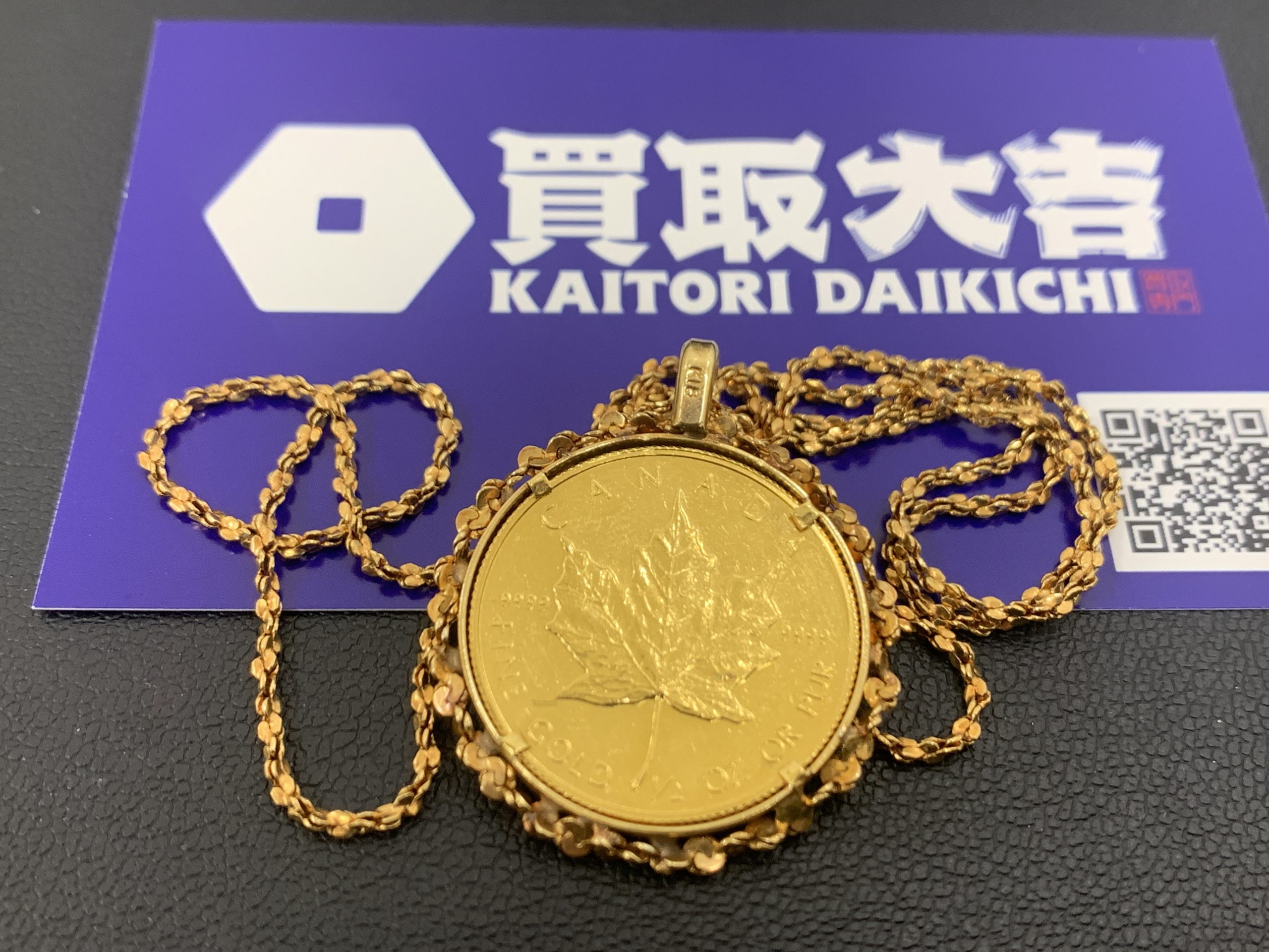 K24メープルリーフ金貨付き18金ネックレスお買取致しました買取大吉石下店です。