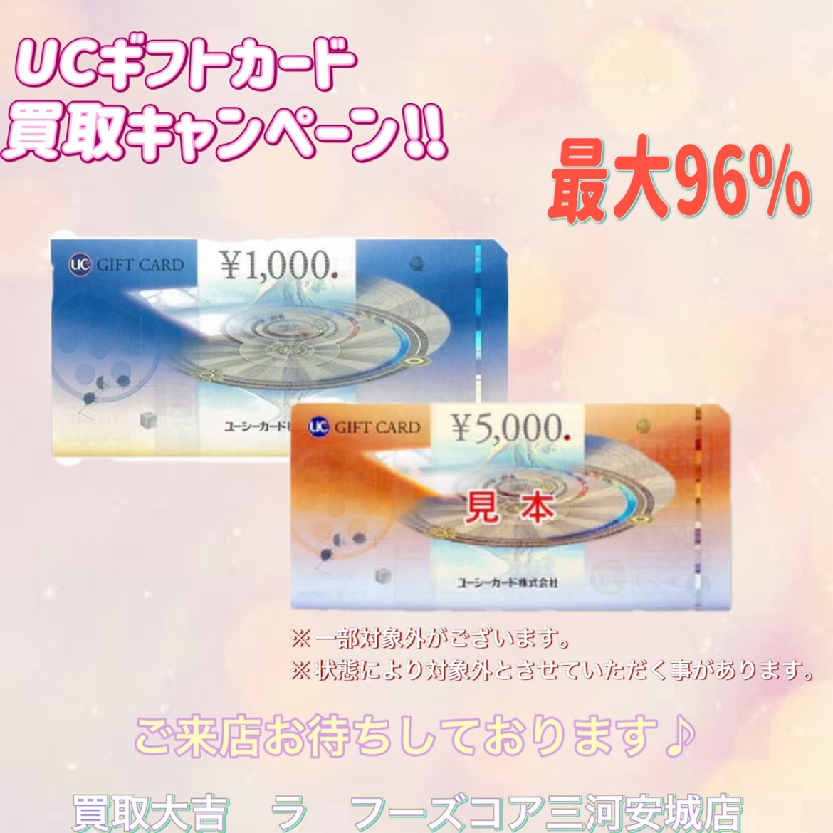 当店では、本日から9月26日~10月2日までUCギフトカードを最大96%で買取強化しております!