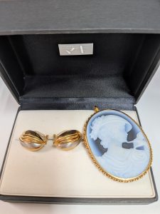 今回は、ジュエリーボックスに収められたカメオのペンダントトップと、デザイン性の高いイヤリングをお買取りさせていただきました。