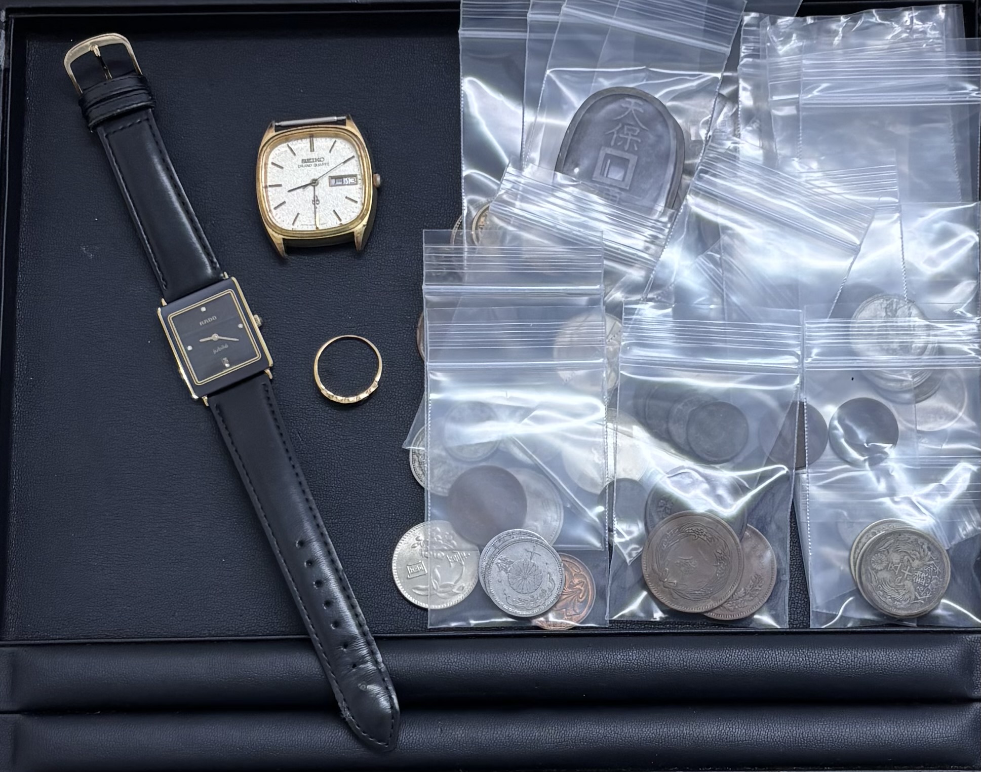 金の指輪、ブランド時計、古銭をまとめて買取させていただきました。
