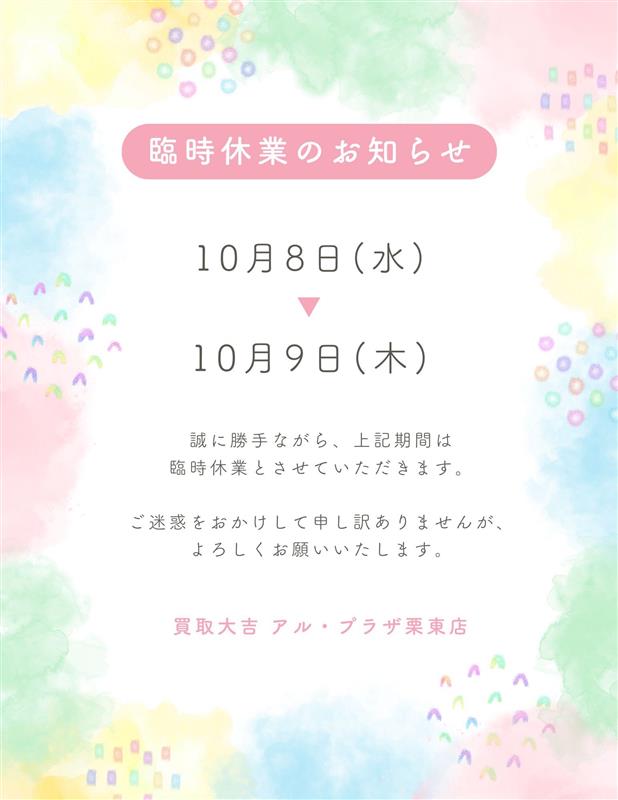 令和7年10月8日(水)~9日(木)は臨時休業とさせていただきます♡買取大吉 アル・プラザ栗東店です🌟このタイトルをクリック☝してね♡ | アル・プラザ栗東店