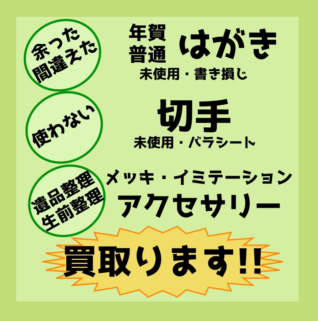買取大吉 西国立駅前店ではハガキや切手、イミテーション・メッキアクセサリーも喜んでお買取りさせていただいております。