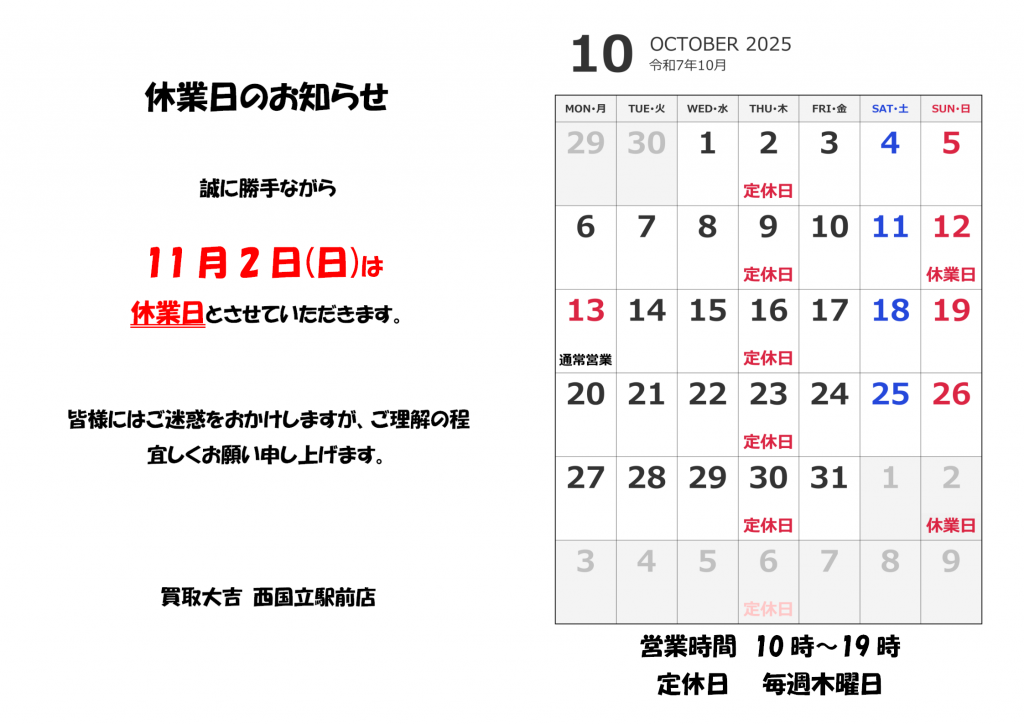 ※誠に勝手ながら、11月2日(日)は休業日とさせていただきます。