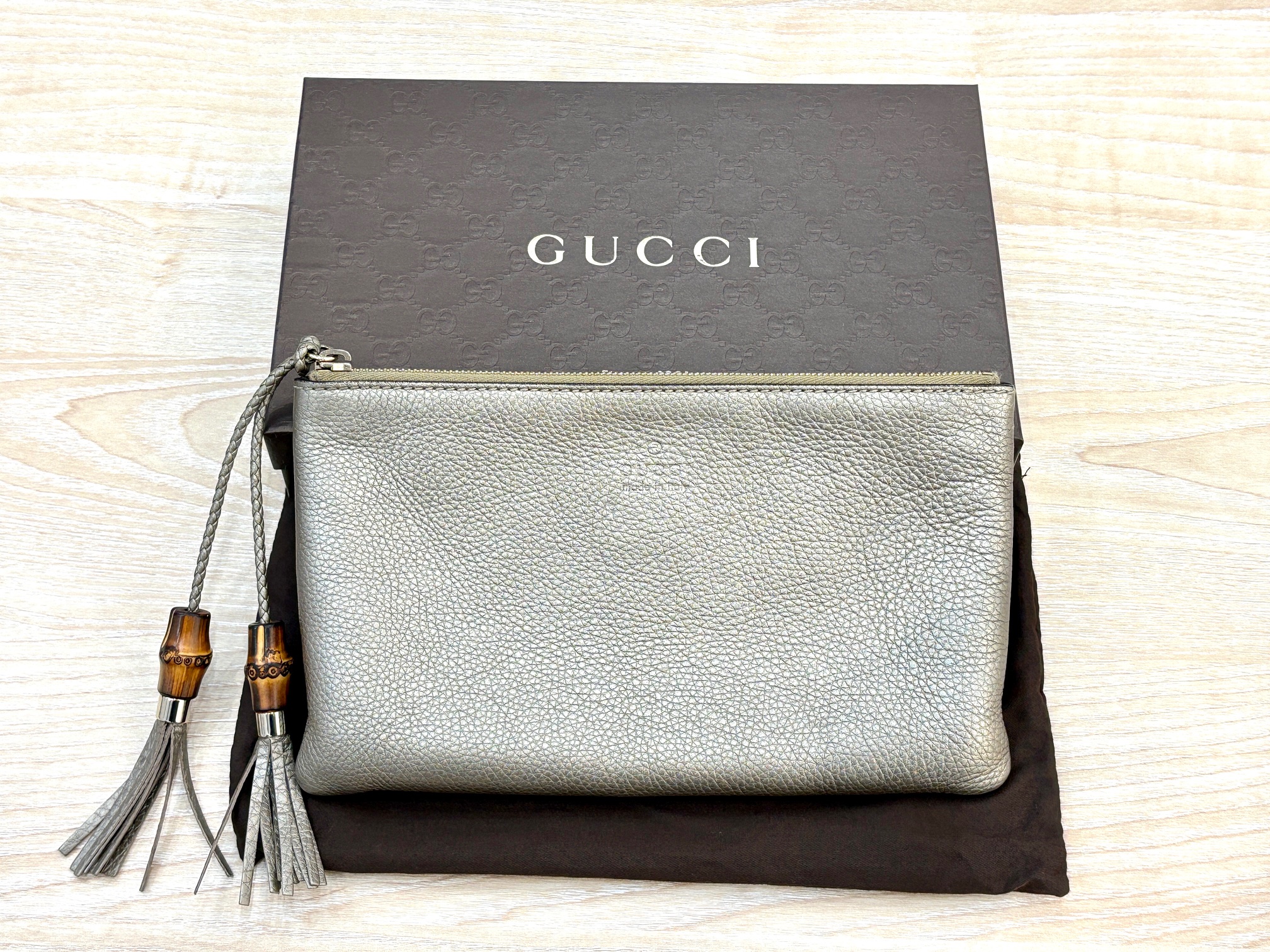 上の写真は日本の竹が使われている「バンブー」シリーズのクラッチバッグ、