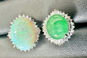 お持ちくださったお品物はオパールと翡翠の大玉リングでそれぞれメレダイヤが