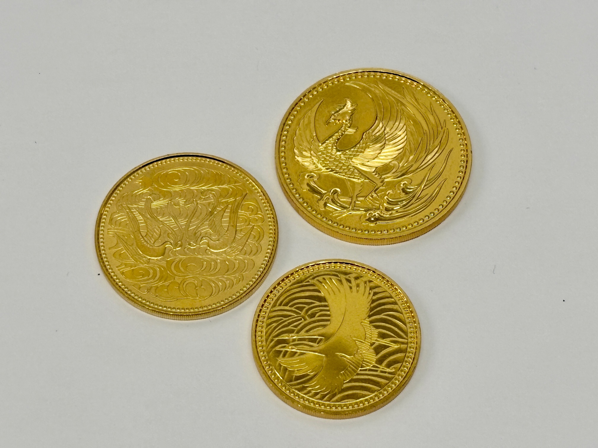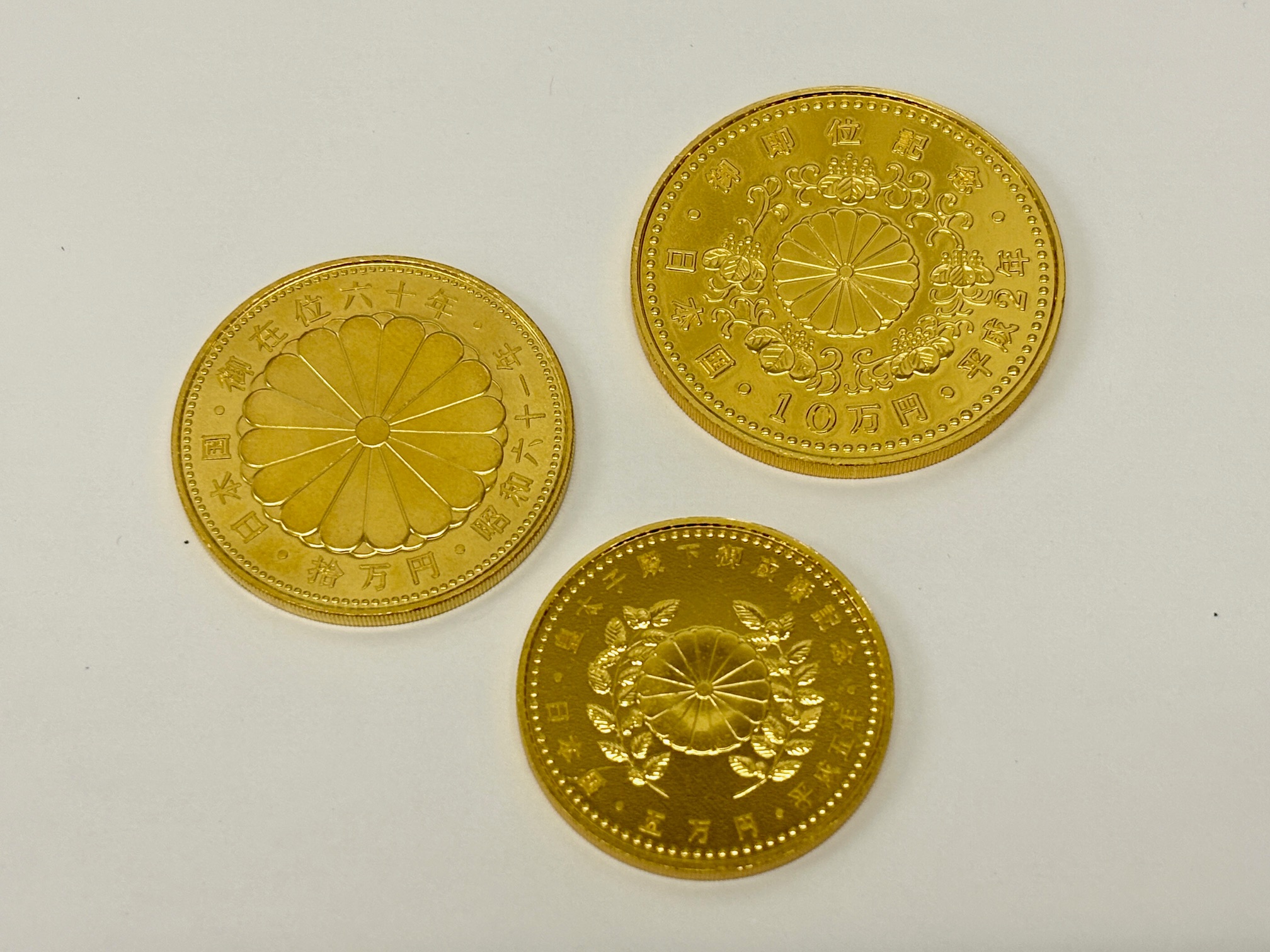 上記写真の3枚は、天皇陛下や皇室に関する出来事・慶事の際に発行された金貨です。