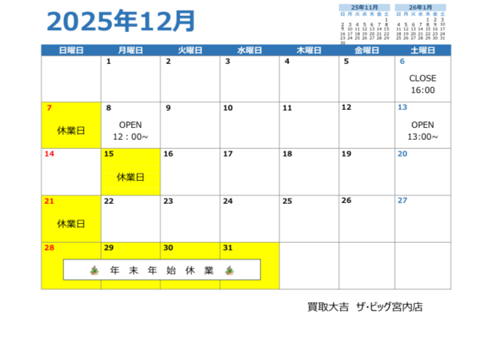 広島県 廿日市市 買取大吉ザ・ビッグ宮内店 12月営業日カレンダー🎅 | ザ・ビッグ宮内店