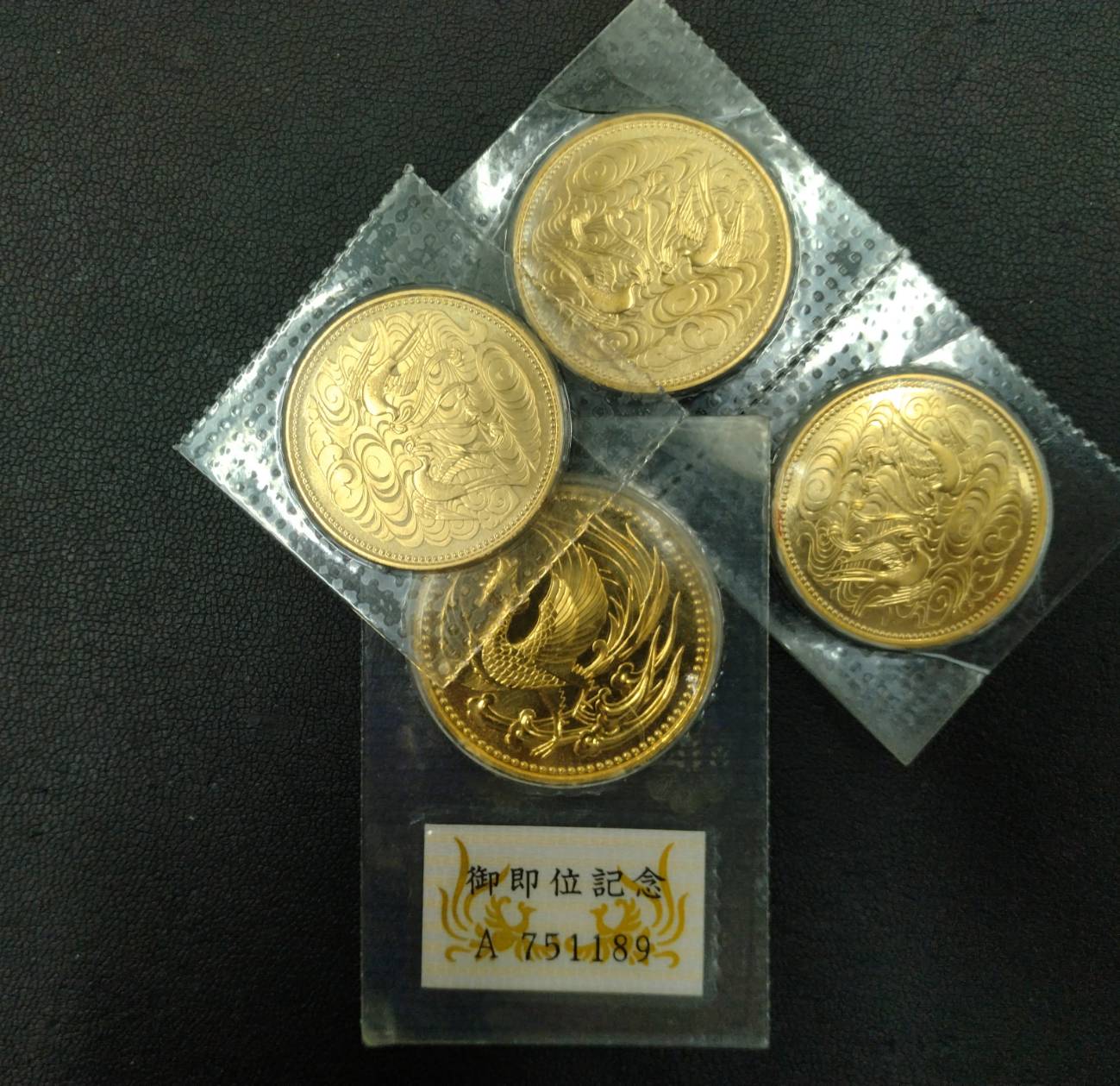天皇陛下御在位60年記念10万円金貨3枚、天皇陛下御即位記念10万円金貨1枚、
