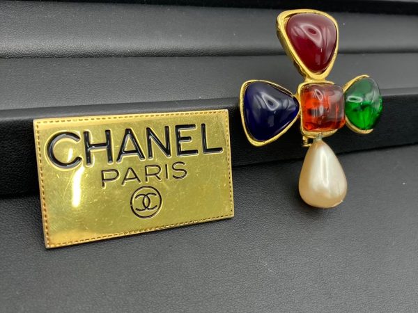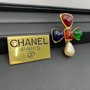シャネルのブローチは、ココ・シャネルの時代から続く長い歴史を持ち、特にココマークやカメリアといった象徴的なモチーフと、ガラスやメタルを駆使したカラフルなコスチュームジュエリーが特徴です。