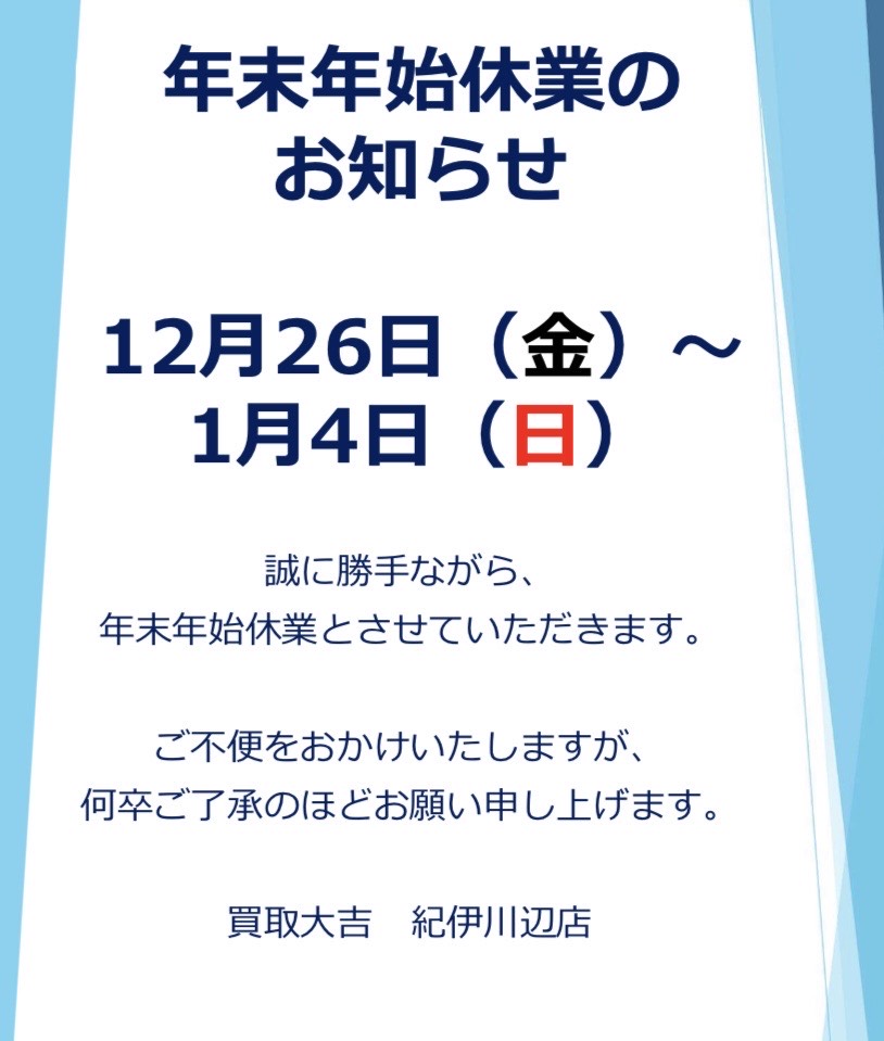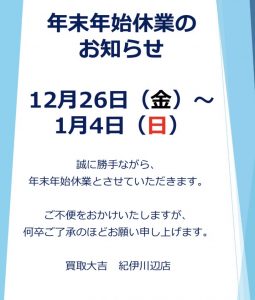 年末年始休業のお知らせ | 紀伊川辺店