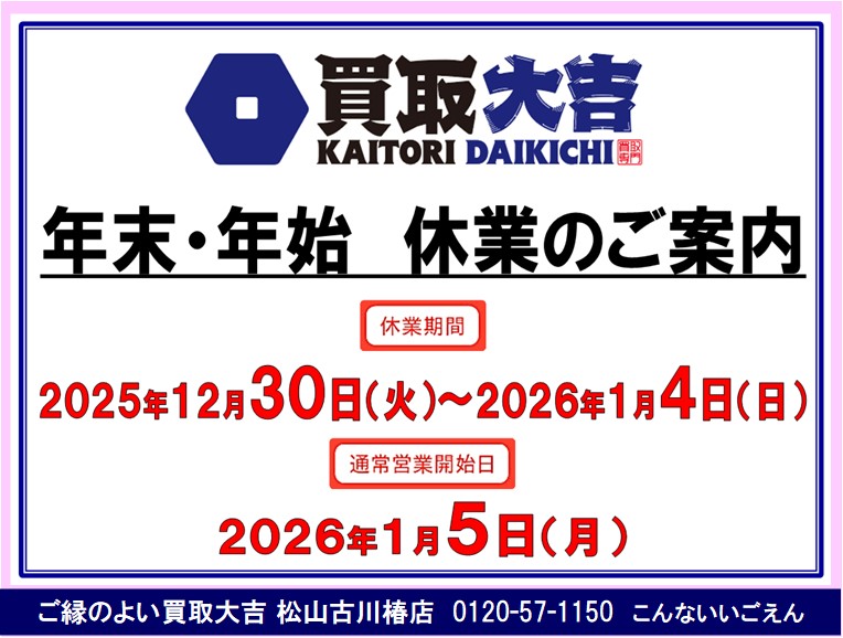 買取大吉» 店舗紹介» 松山古川椿店» 松山古川椿店 店長ブログ» 年末・年始 休業のご案内!                       ご縁のよい買取大吉 松山古川椿店におまかせ下さい♪