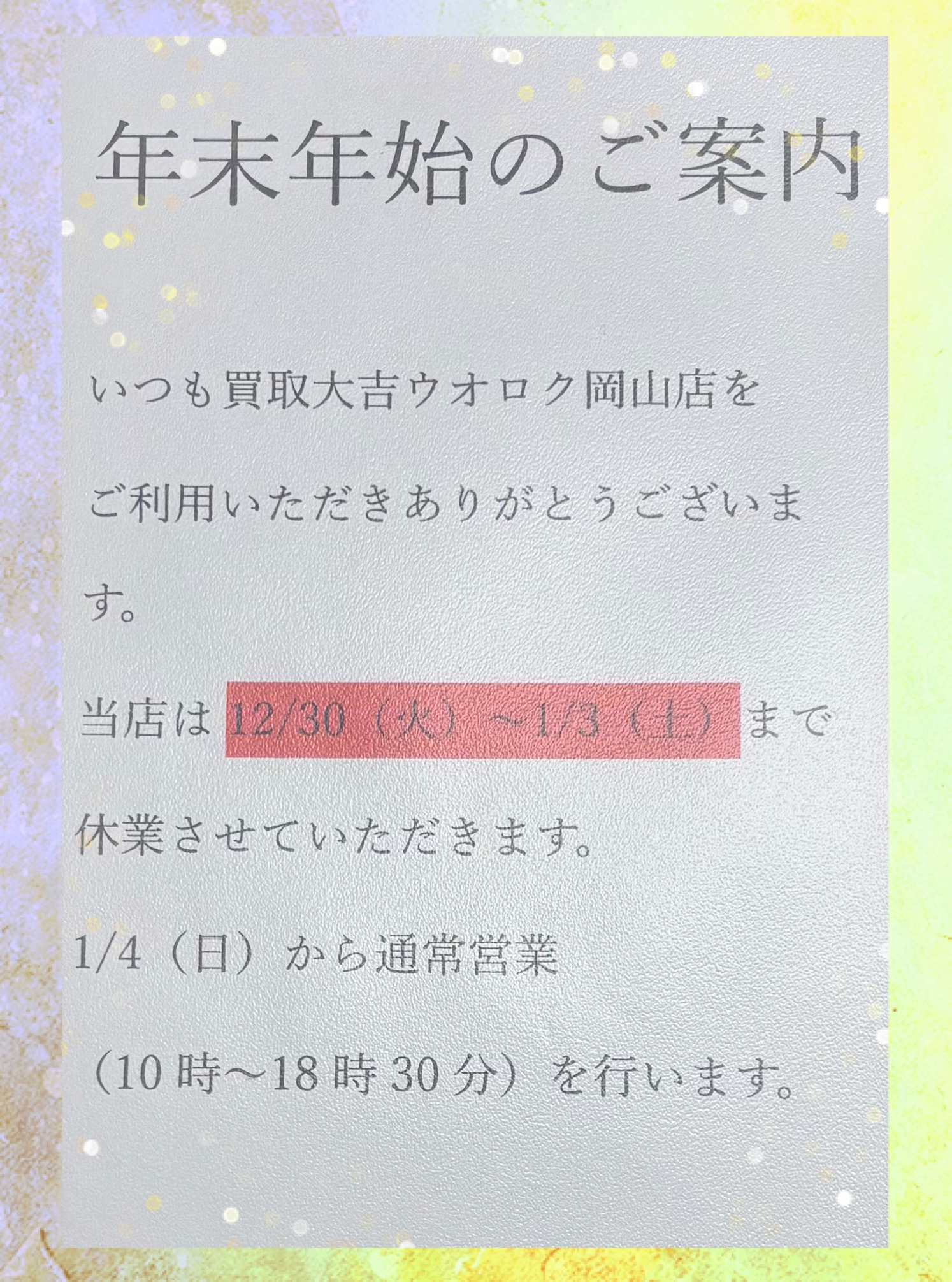 年末年始のご案内!阿賀野市にございます買取大吉ウオロク岡山店です。 | ウオロク岡山店