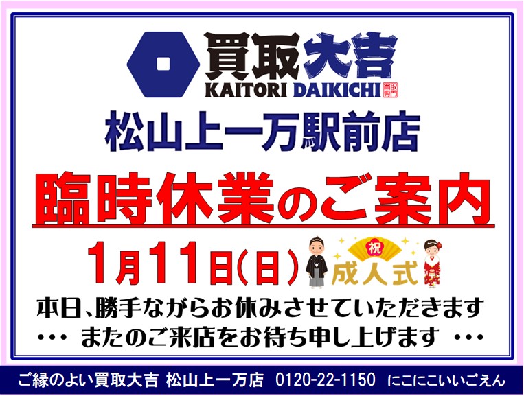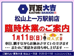 1月11日(日)臨時休業のご案内! ご縁のよい買取大吉 松山上一万駅前店におまかせ下さい♪ | 松山上一万駅前店