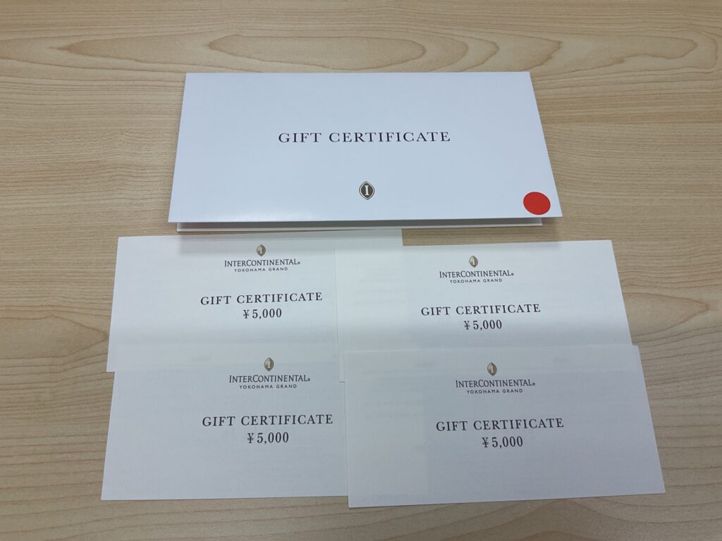 は横浜のインターコンチネンタルホテルでご利用いただける5,000円分のギフト券を4枚、お買取りさせていただきました。ご来店いただき、誠にありがとうございます。