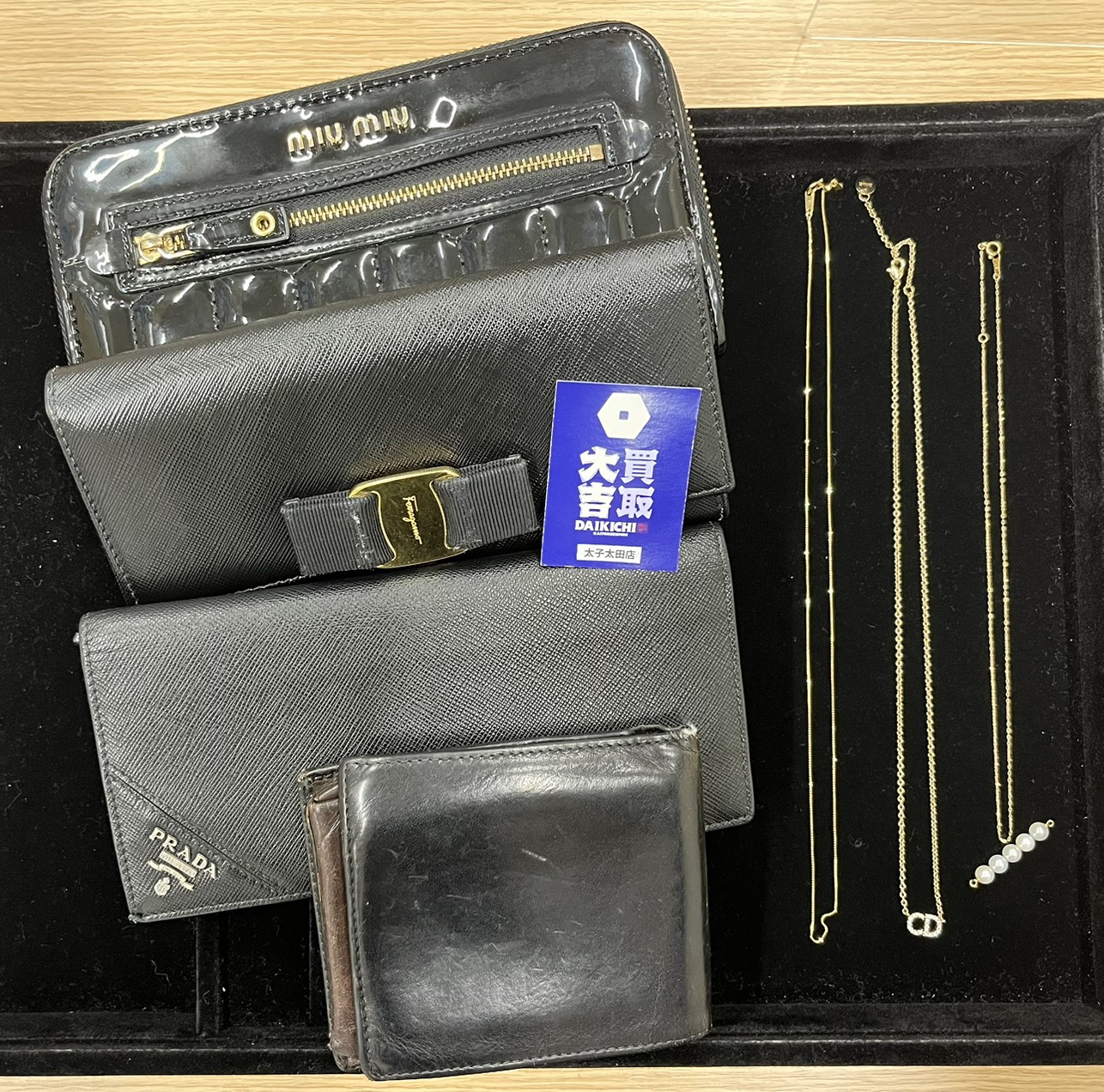 今回の買取実績は、プラダ・ミュウミュウ・フェラガモ・オロビアンコの財布とディオールのネックレス、K18のネックレスになります✨
