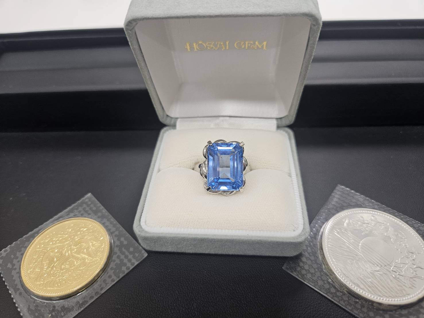 こちら天皇陛下御在位金貨&銀貨と14.16ctのブルートパーズのプラチナリングをお買い取りさせていただきました✨