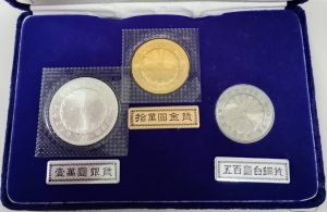 こちらは昭和天皇の御在位60年を記念して発行された硬貨セットで、10万円金貨・1万円銀貨・500円白銅貨の3点が揃ったお品物です。