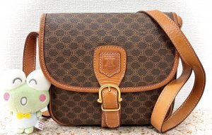 CELINE(セリーヌ)の定番人気「マカダム柄」ブラウンPVC×レザーのショルダーバッグをお買取りさせていただきました。
