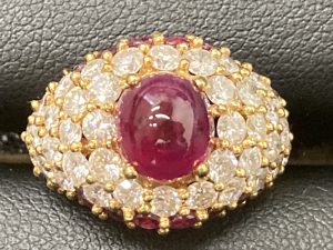 中心のルビーは丸みのあるカボションカットが選ばれており、周囲のメレダイヤモンドがその色味を引き立てる豪華な作りとなっています。