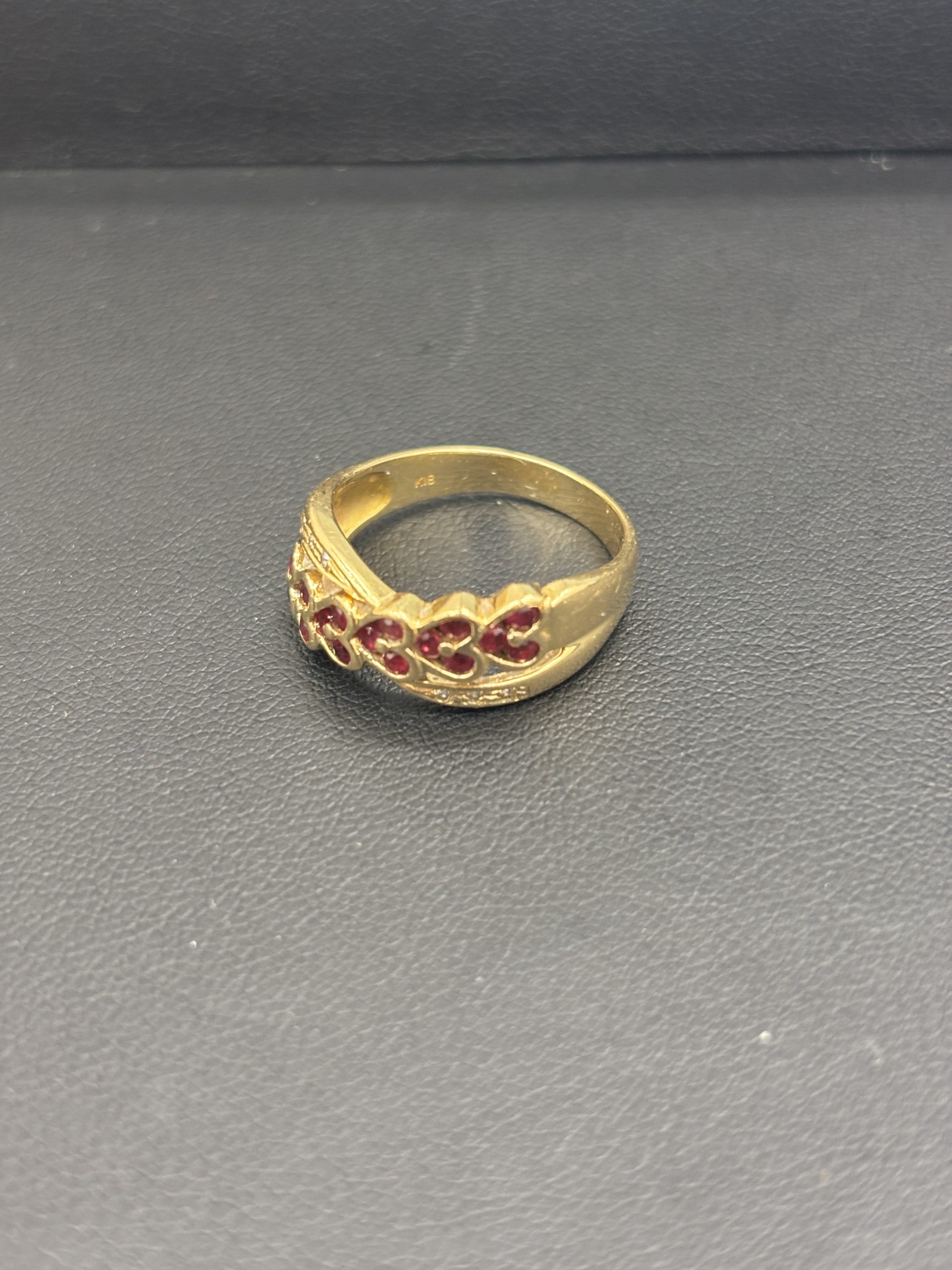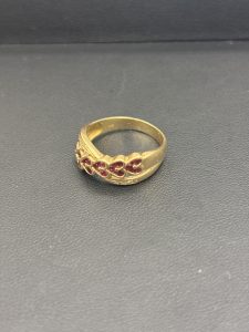 可愛らしいハート型の赤石が5石並んだデザインで、装飾性も高く、地金としての価値に加えてジュエリーとしての魅力もある一本。