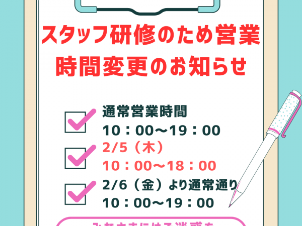 誠に勝手ながら、社内研修につき、2月5日(木)は18時までの短縮営業とさせていただきます。