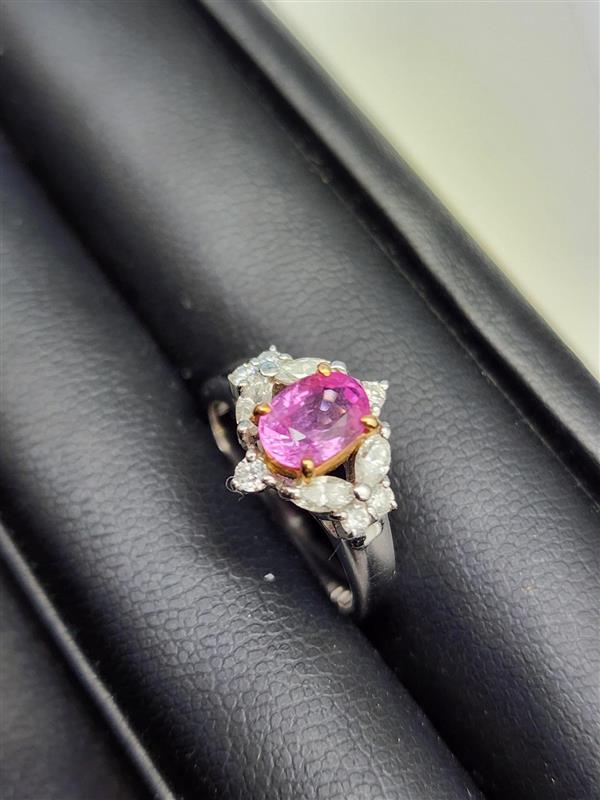 中央には存在感のあるピンク系の石、その周囲には繊細に配置されたクリアストーンが輝く華やかなデザイン。