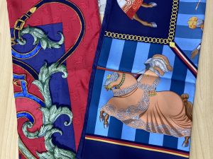 お持ちいただいたのは、エルメスの歴史を感じさせる馬や騎士をモチーフにしたデザインのスカーフです。